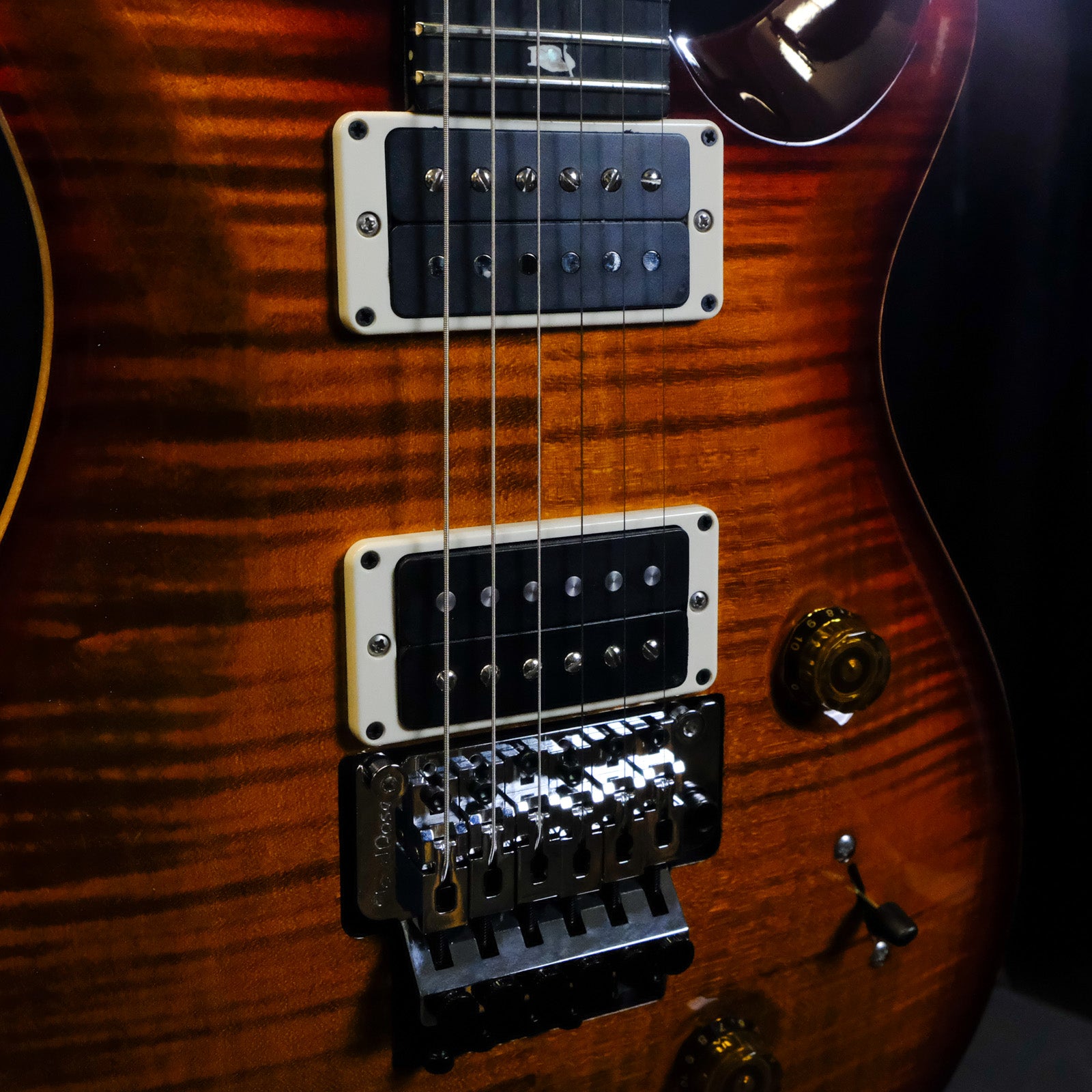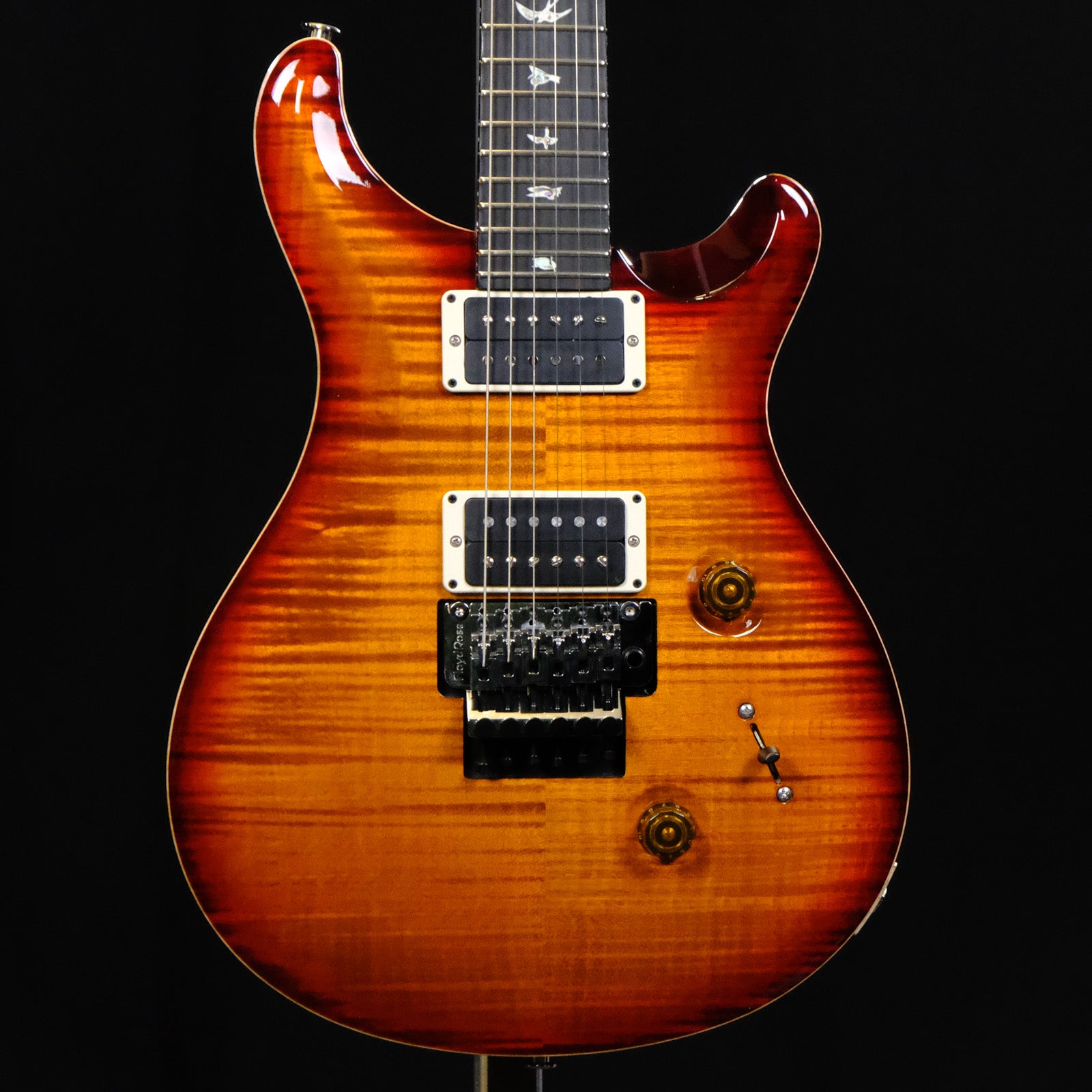 The Custom 24 "Floyd" is equipped with the time-tested Floyd Rose "Original" tremolo system and PRS's \ m / (metal) pickups. The Floyd Rose "Original" tremolo and locking nut tuning system is a double-locking design precision-made from high quality steel. This design combination allows players to lock the string at the nut and at the bridge to keep the guitar in tune even during the heaviest dive-bombing sessions.